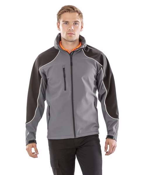 Water resistant seamless shoulders. Windproof. Result® 3 layer softshell technology. Breathable. Fully waterproof hood. Soft 2-way stretch fabric. Comfortable active cut. Concealed fully lined hood with tear release closing chin guard, wired visor and shockcord adjusters. YKK full front zip fastening. 2 mesh lined zip closing side pockets for extra venting, 1 mesh lined zip closing chest pocket for extra venting, 2 large inside pockets and 1 inside phone pocket. Easy open zip pullers. Adjustable shockcord hem. Tear release adjustable cuffs. Inner storm flap. 3M™ reflective safety piping to shoulders and sleeves. Zip opening underarm vents with mesh cover. Concealed access for print and embroidery. Waterproof fabric.Decoration Guidelines:Decorating methods: Embroidery. Decorators access point: Concealed left chest zip.