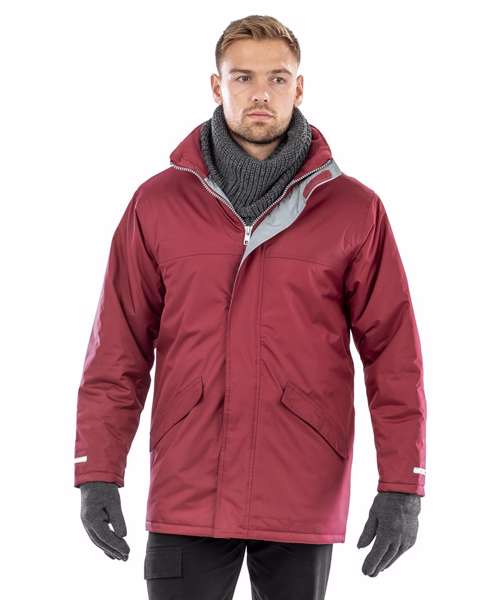 Waterproof-StormDri 2000. Windproof. Fully taped waterproof seams. Long fit. Super warm. Concealed 3-panel hood in collar. Full front heavy duty zip. 2 concealed front pockets with storm cover. Super warm fleece-lined collar. Reflective cuff and back detail. Name and class tag inside left pocket. Fleece-lined front pockets. Adjustable drawcord hem. Ready to brand cut cut-away label. Decorating methods: Embroidery, direct print, digital transfer print, and screen print transfer. Decorators access point: Full hem and left chest.