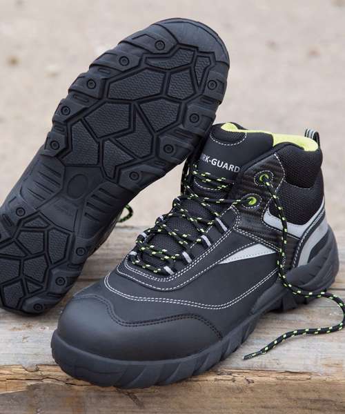 Composite midsole for underfoot protection. Padded ankle cuff and tongue. Energy absorption heel. SRC slip resistance. Bottle green trim. Reflective detail. Anti-static. Scuff cap. Loop pull. Zero rated VAT. Tough and hardwearing. Lightweight ankle protection. EN 20345:2011 S3 SRC.