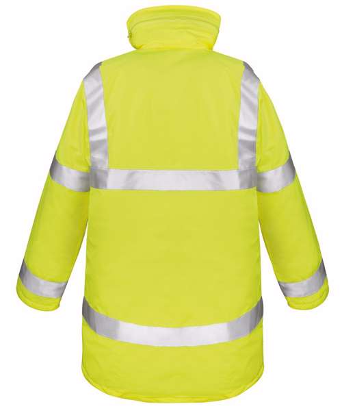 EN ISO 20471:2013 + A1:2016 Class 3. EN 343:2019 3:1. RIS-3279-TOM ISSUE 2:2019 Class 3 (orange). Waterproof 3000mm. Windproof. 50mm sewn on reflective body bands incorporating 3M™ Scotchlite™ Reflective materials – strategic positioning for full shoulder and LBP decoration. Generous size allows for over garment wear. Heavy duty zip with stud closing storm flap. Concealed adjustable hood in collar. Seamless watershed shoulders. Underarm ventilation eyelets. 3 external pockets. Fully taped seams. Inside pocket. Hang loop. Note: These garments should be worn fastened and kept clean to maintain effectiveness. Conforms to 89/686/EEC directive. Decorating methods: Embroidery, transfer print, direct print. Decorator access point: Inner back hem zip.
