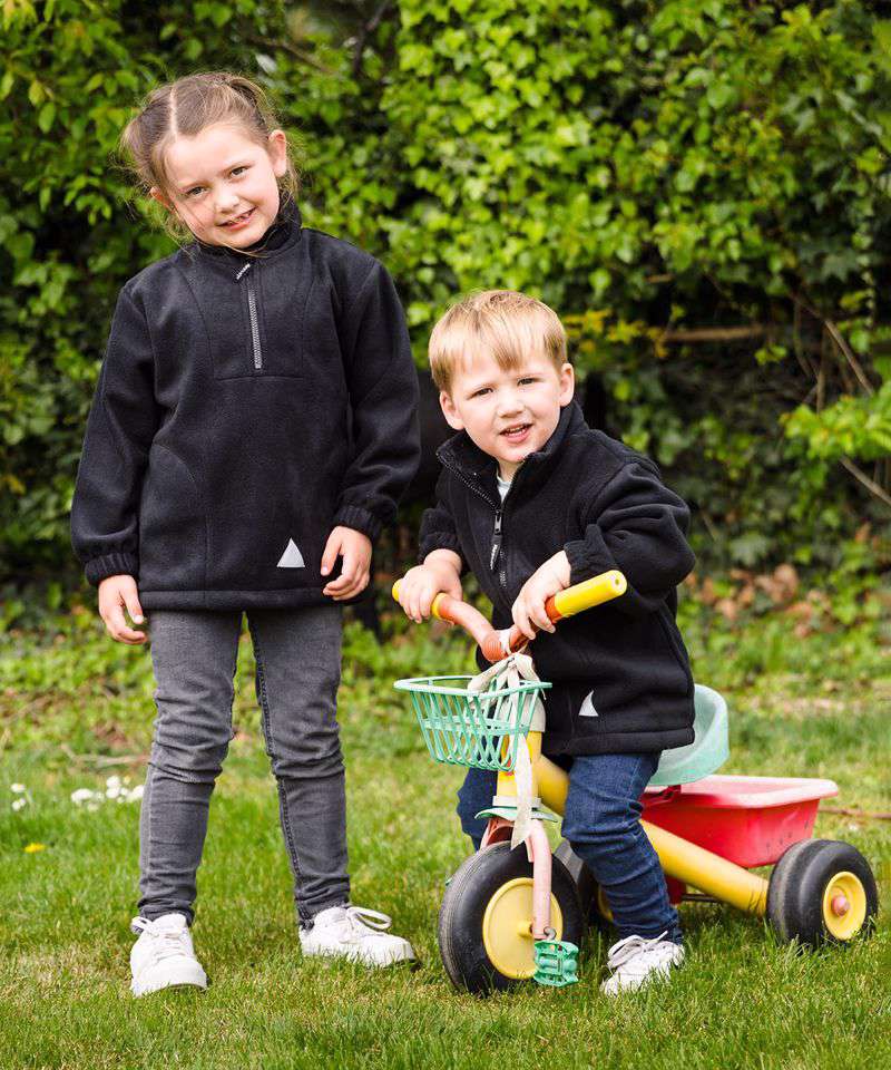 Casual cut. ¼ front zip fastening. 2 side pockets with fleece lining. Elasticated cuffs. EN14682 compliant. Adjustable shockcord hem. Triangles incorporating 3M™ Scotchlite™ reflective materials. Unlined. Stretchy fit. Hardwearing. Easycare. Anti pilling. School favourite.Decoration Guidelines:Decorating methods: Embroidery, Transfer print, Screen print transfer & Laser Etch Decorators access point: Open.