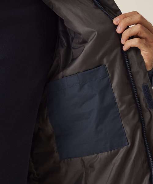 Waterproof Hydrafort polyester fabric. Quilted polyester lining. Recycled Thermoguard insulation. Longer-length parka jacket. Concealed hood with adjusters. Made using recycled materials.
