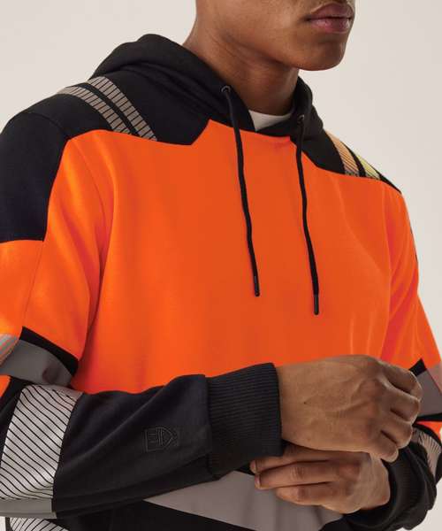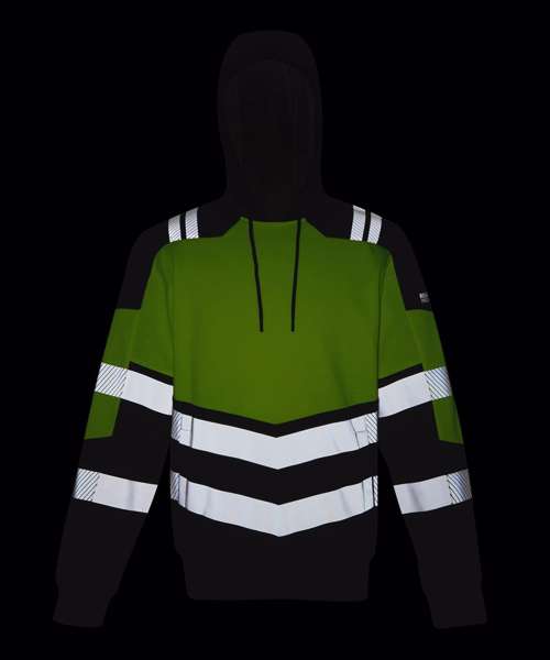 100% brushed back polyester fabric soft touch – 310gsm. Certified EN ISO 20471:2013 +A1:2016 Class 2. Heat-applied reflective tape, with segmented tape on strategic panels for additional comfort. Grown-on hood with adjusters. Kangaroo pocket to front. Ribbed collar and cuffs. ID reflection – angled chevrons identify which way you are facing. Made with recycled content.