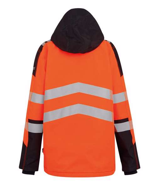 Waterproof and breathable Isotex 10000 100% polyester ripstop fabric. Certified EN ISO 20471:2013 +A1:2016 Class 2. Conforms to EN343:3.3. Heat-applied reflective tape, with segmented tape on strategic panels for additional comfort. Pit zips for added breathability. Foldaway hood with adjuster. One internal zipped chest pocket and internal bottle holder pocket. Six pockets. One radio loop. Inner stormguard. ID reflection – angled chevrons identify which way you are facing. Made with recycled content.