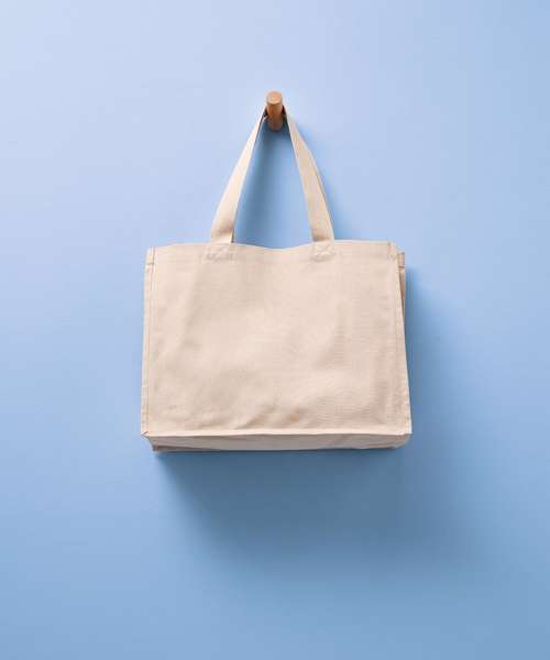 Stand-up shopper made from recycled cotton canvas. 220gsm, with a polyurethane coating that enables it to stand up. Soft webbing handles.