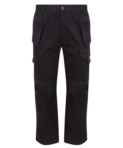Zip fly front fastening. Part elasticated waist band with belt loops. Two side front tradesman pockets. Two upper leg utility pockets, right hand side ruler pocket, left hand side utility and phone pocket. External knee pad pockets with tear and release fastening. Two back patch pockets. Hammer loop. Twin-needle stitching on hem.