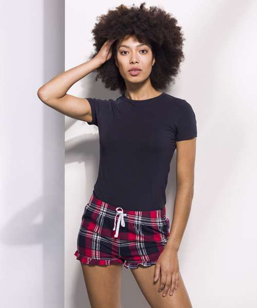 Woven tartan shorts with frill hem. Full elasticated waist with contrast mock drawcord. Tear-out label.