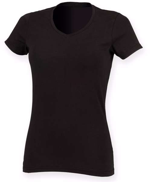Feel good women's stretch t-shirt with enzyme wash for unique soft hand-feel. 96% cotton, 4% elastane for improved fit, comfort and shape retention. Modern long-line fit. V-neck with back neck binding and soft stretchy rib neckline. Features tear out label.