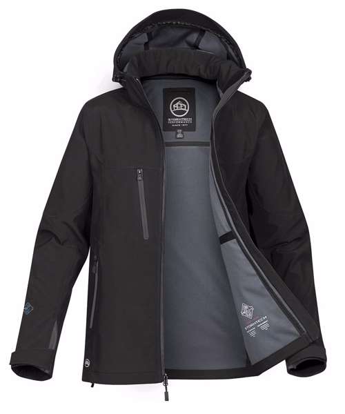 STORMTECH H2XTREME® 10,000. 3,000 Waterproof. Breathable outer shell. Sealed seams. Waterproof zippers. Detachable articulated storm hood. Adjustable shock cord hood. Adjustable hem.Dropped back. Dual chest pockets. Articulated action elbows. Adjustable cuffs with gusset.