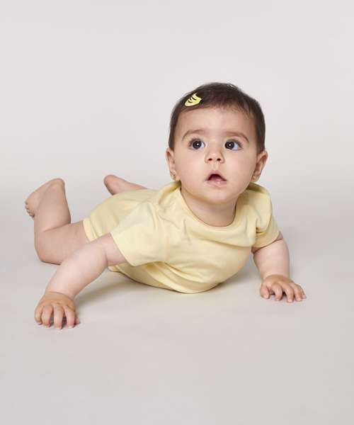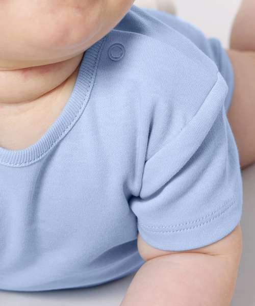 Short sleeve baby bodysuit. Set-in sleeve. 1x1 rib binding at neck collar and leg opening. Snap placket at shoulder. Snap closure at bottom.