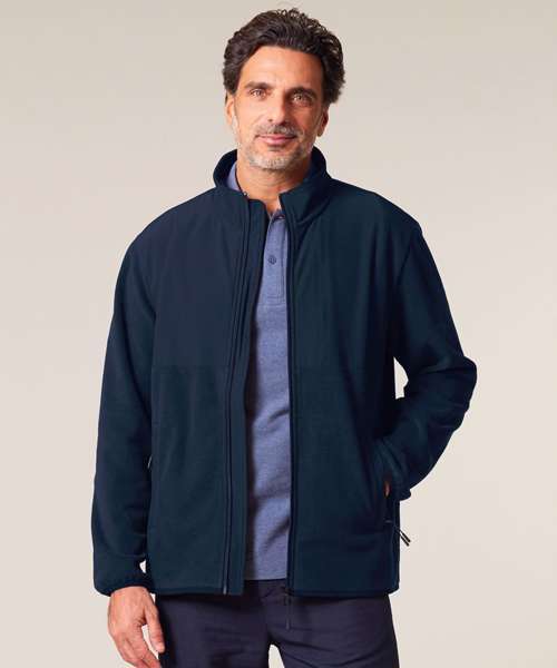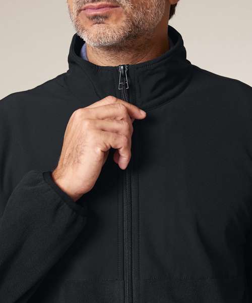 Set-in sleeves. Elastic binding at cuffs and hem. Inside back neck binding loop and back neck tape. Nylon coil zip with metal zip pull and cord ending. Brushed polar fleece fabric with anti-pilling finish on the inside and outside. Front side welt pockets with hidden zip closure. Contrast softshell fabric at the yoke and outer collar. Inside invisible zip at the wearer’s left chest for easy decoration.