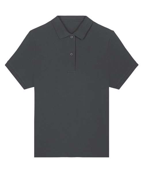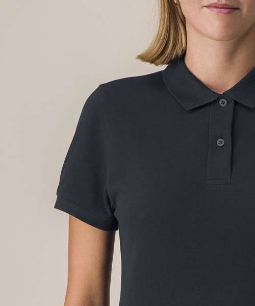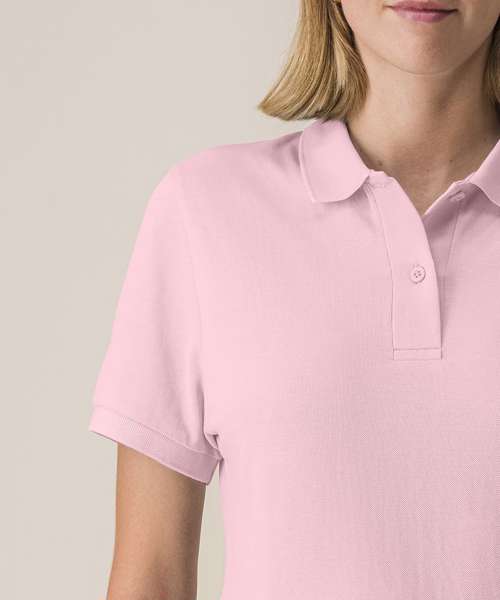 The Stella Coaster mid-light polo for women. Fitted. Set-in sleeve. Flat knit rib on collar and sleeve hem. Inside heavy single Jersey back neck tape. Front inserted placket with two buttons in matching body colour. Slit and bartack finish at side seam hem. Single-needle topstitch at shoulder seams. Bottom hem with narrow double-needle topstitch.