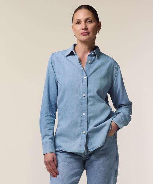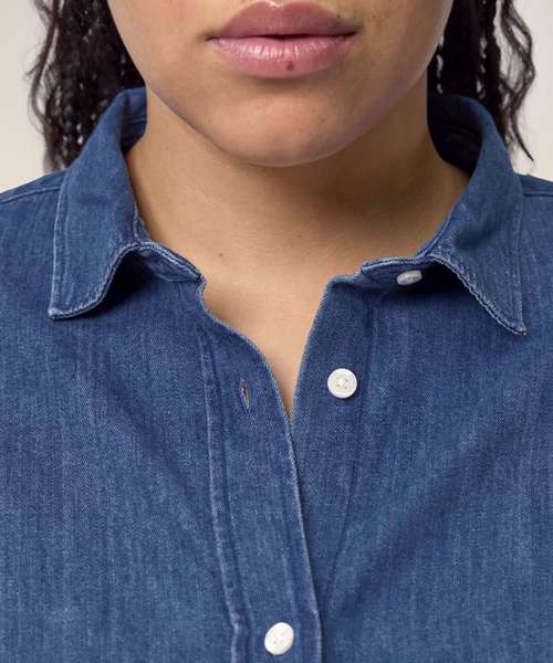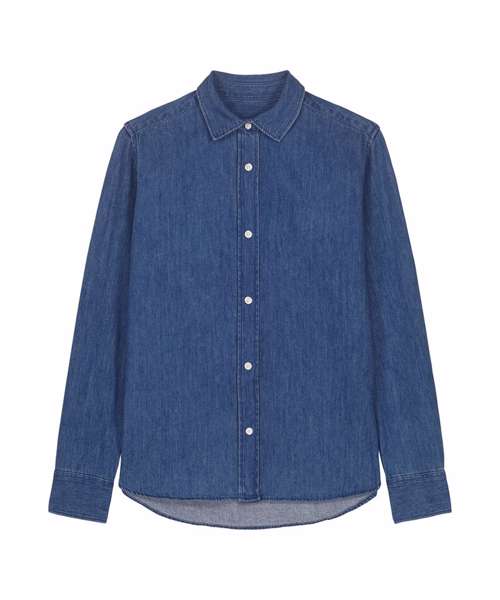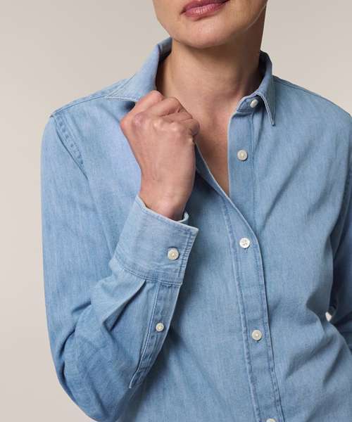 The Stella denim shirt, for women, is a timeless staple that perfectly balances style and sustainability. With its medium fit and classic denim style, this shirt serves as a versatile layering essential in any wardrobe, as it can be styled in many ways. Crafted from sturdy 235gsm indigo-dyed denim fabric, this organic cotton denim shirt is perfect for those looking for sustainable women’s fashion to create unique, custom garments. Its minimalist design offers the ideal blank canvas for customisation; and with no back pleat, the decoration possibilities are endless.