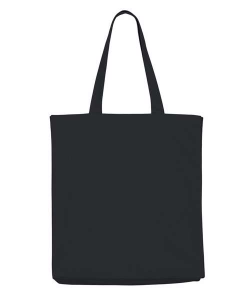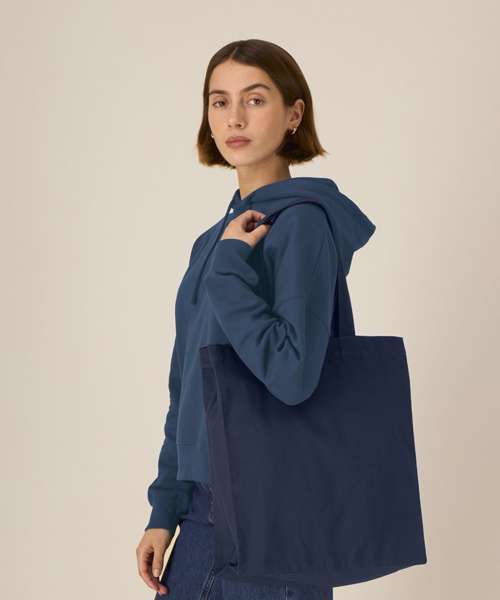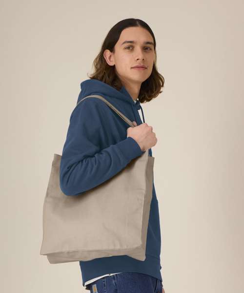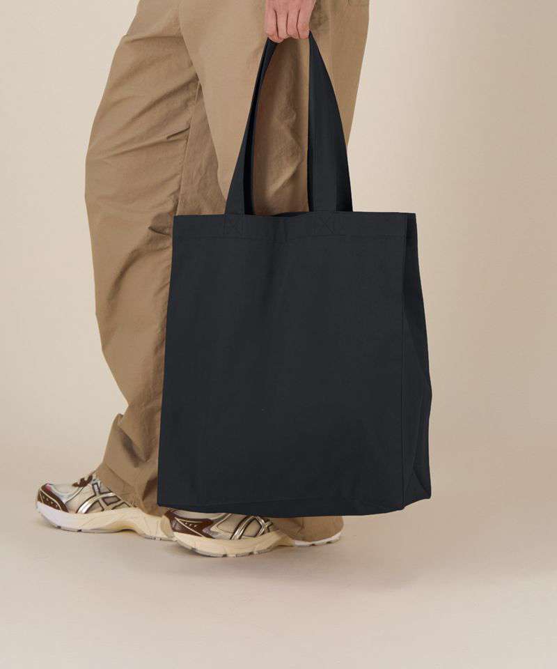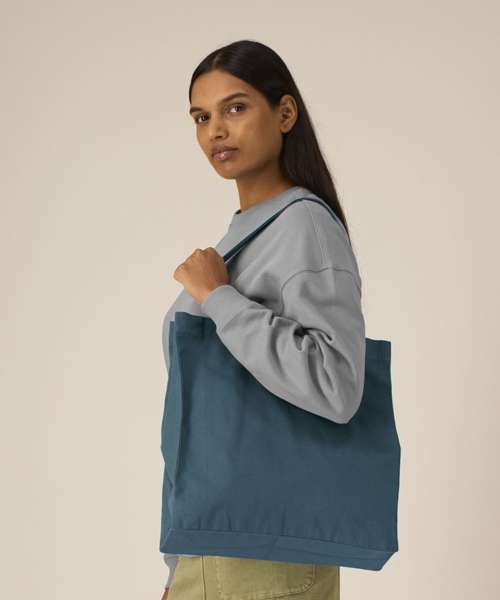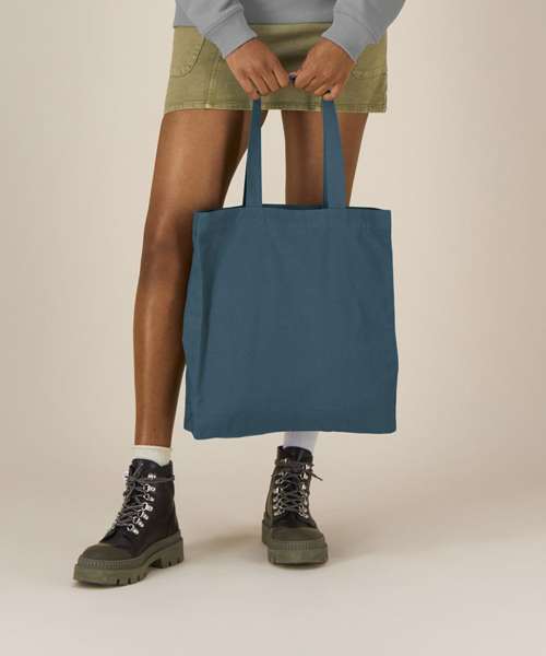 Midweight tote bag. Folded hem at top edge. Bottom and side soufflé. Long self-fabric handles with cross-stitch for reinforcement. Inside self-fabric pocket. Single-needle stitch at top edge.