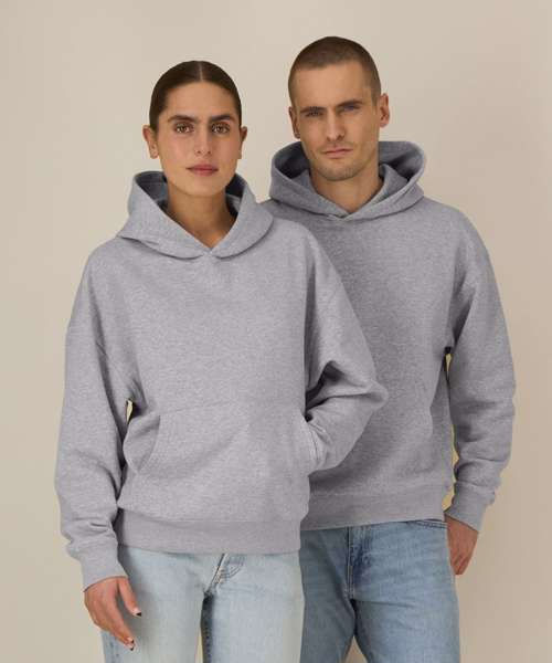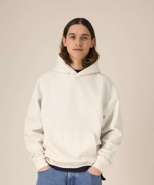 Iconic mid-light unisex hoodie sweatshirt. Relaxed fit. Set-in sleeve. Self-fabric lined hood. 1x1 rib at sleeve cuff and hem. Kangaroo pocket. Inside back neck herringbone tape. Half moon at back neck.