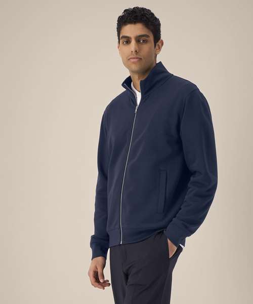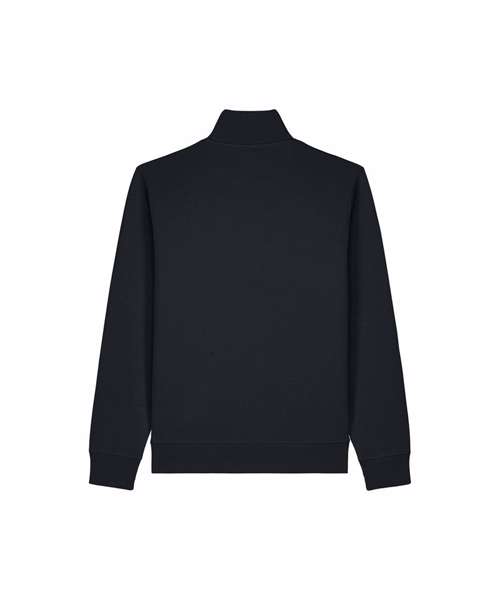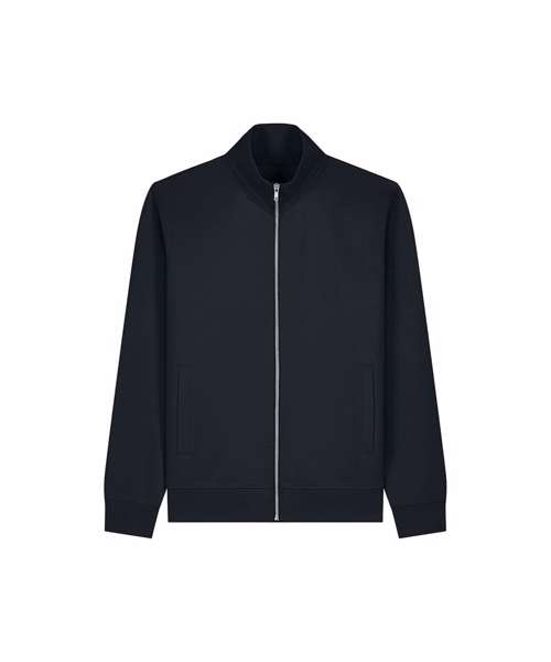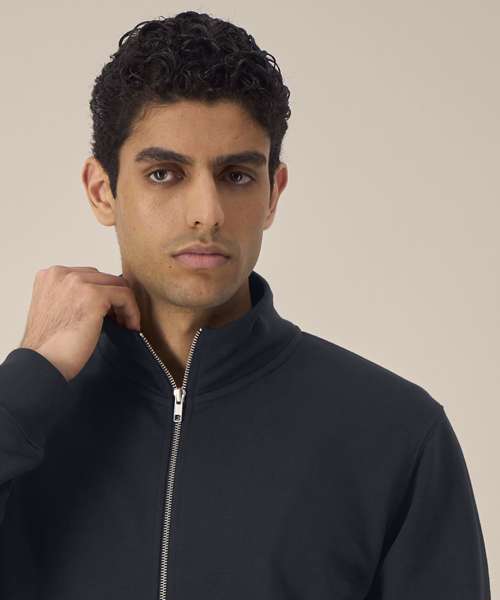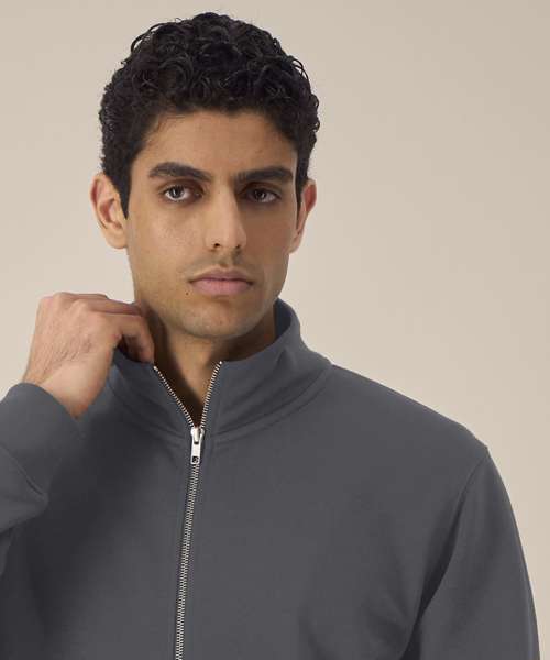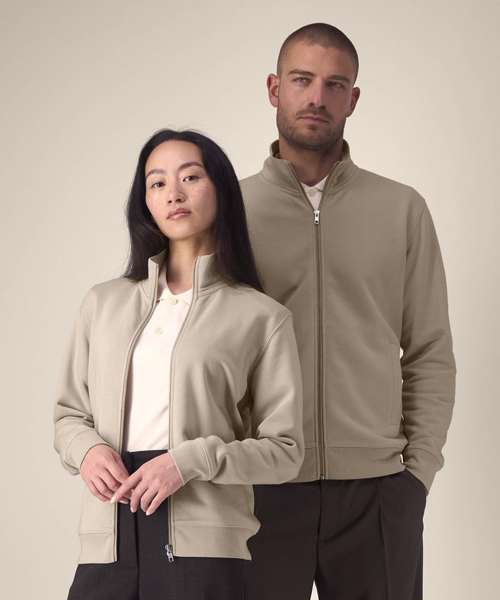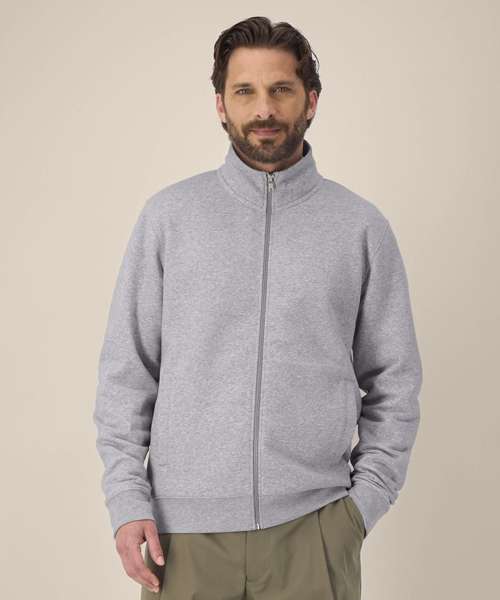 Unisex high-neck zip-through sweatshirt. Set-in sleeves. Self-fabric high-neck collar. Inside herringbone back neck tape. Self-fabric half-moon at the back neck. Metal zip at centre front. Welt pockets. 1x1 rib at sleeve cuffs and hem. Contains certified organic cotton and recycled polyester.