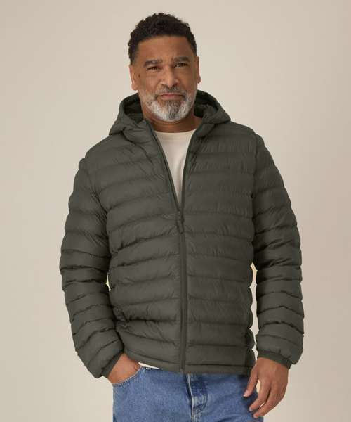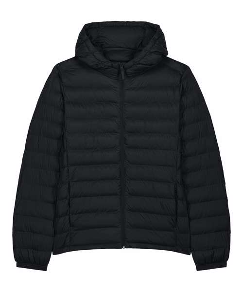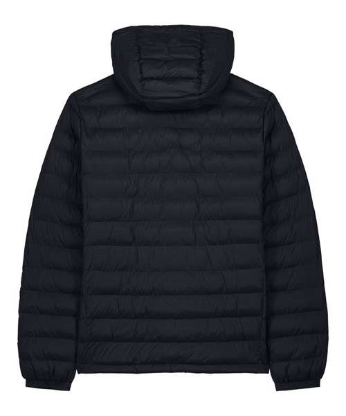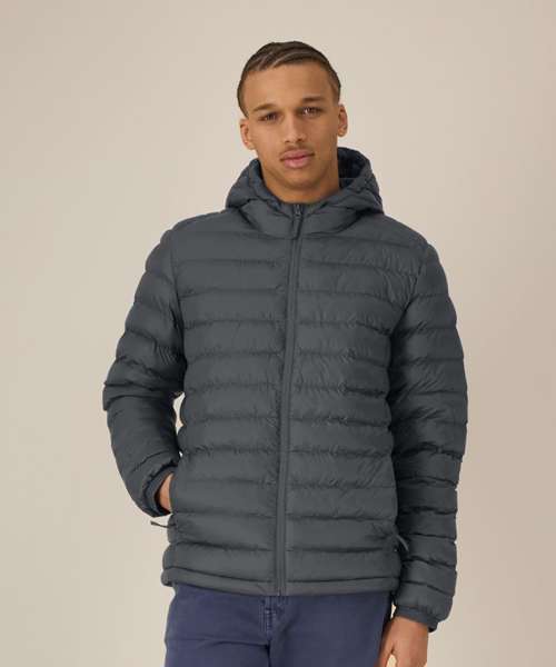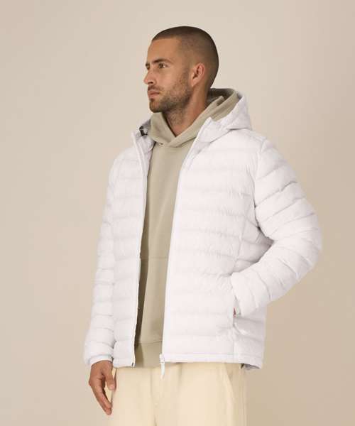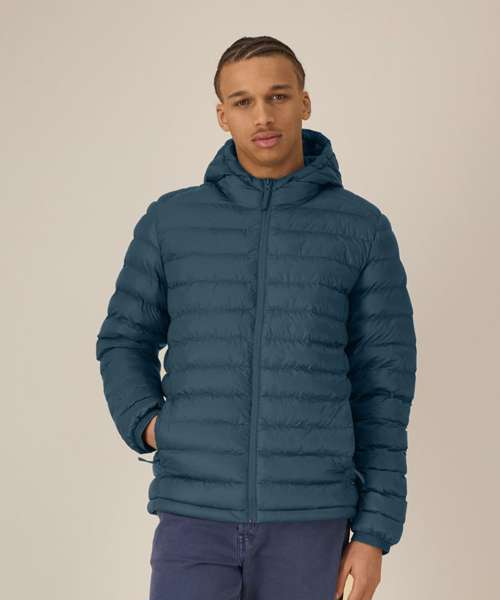 Men’s padded jacket. Medium fit. Set-in sleeve. High collar with a grown-on hood. Adjustable hood opening and bottom hem with plastic stopper and elastic cord. Reverse nylon zip at centre front. Zipped welt pockets with extra grosgrain puller. Fully quilted. Side panels for a better shape. Self-fabric elasticated cuff. Inside seams with binding finish.
