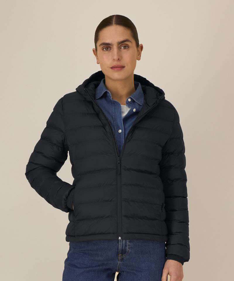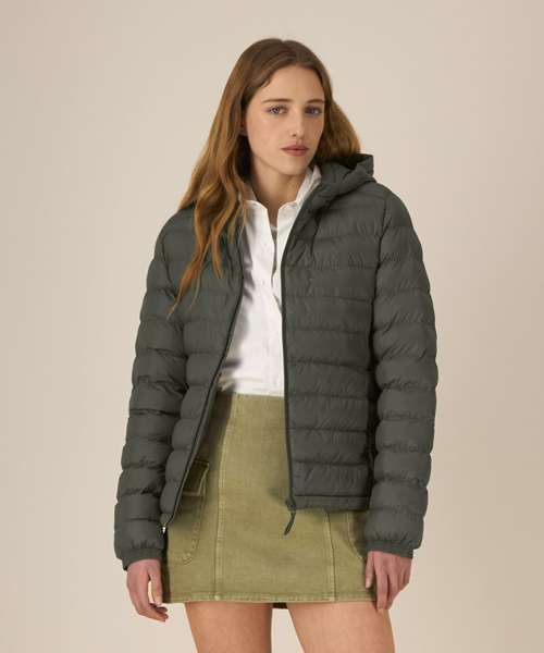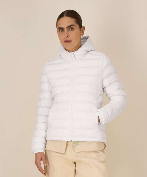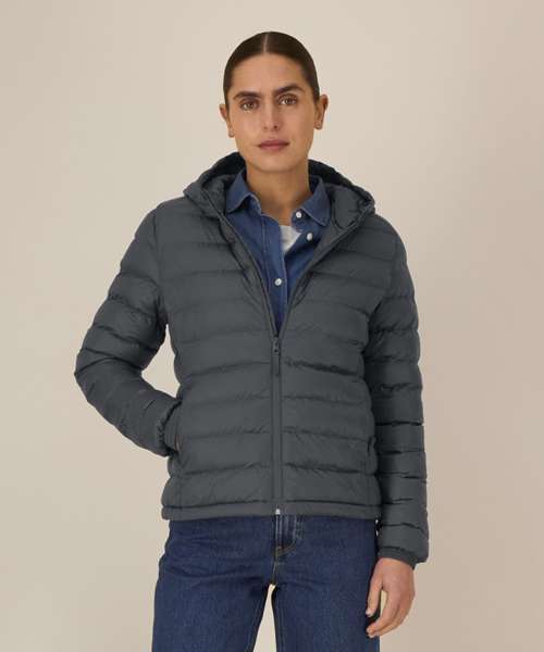 Women’s padded jacket. Fitted. Set-in sleeve. High collar with grown-on hood. Hood opening and bottom hem have an adjustable plastic stopper and elastic cord. Reverse nylon zip at centre front. Zipped welt pockets with extra grosgrain puller. Fully quilted. Side panels for a better shape. Self-fabric elasticated cuff. Inside seams with binding finish. Bottom hem has an adjustable plastic stopper and elastic cord.
