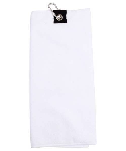 Microfibre tri-fold golf towel. Grosgrain ribbon tab with metal eyelet and snap hook attachment. Carabiner clip. Overlocked edge.