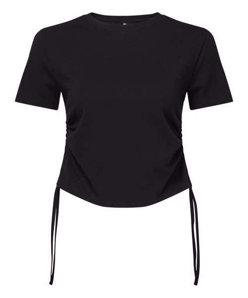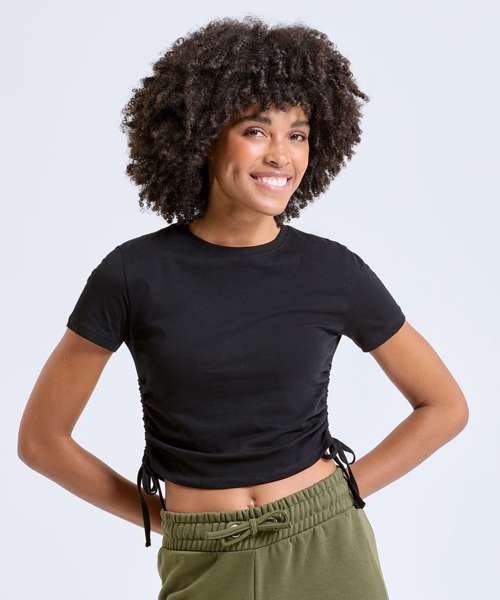 Cropped t-shirt. Short sleeve. Ruched detailing to sides. Tie fastenings. Crew neck. The product contains no branded neck or waist label. Removable kimble or looped garment tags. The inner seam label holds important product information on one label with a second label containing brand information which can be cut-away.