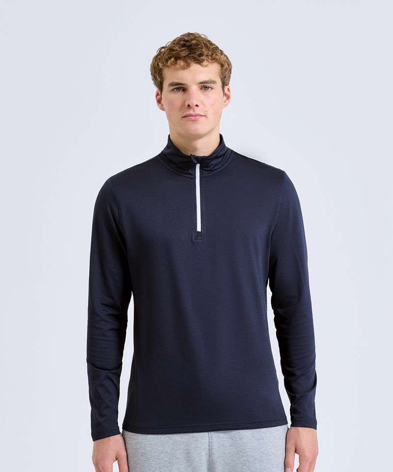 ¼ zip design. Long sleeves. Stretch. Recycled polyester. Wicking fabric. Brushed inner. The product contains no branded neck or waist label. Removable kimble or looped garment tags. The inner seam label holds important product information on one label with a second label containing brand information which can be cut-away. We recommend using block out vinyl and inks.