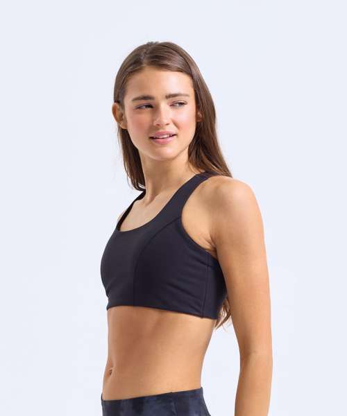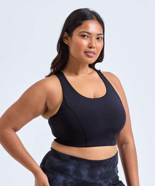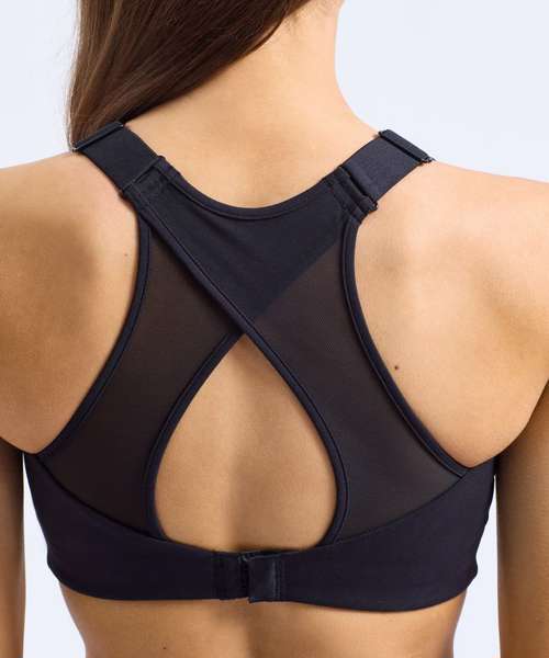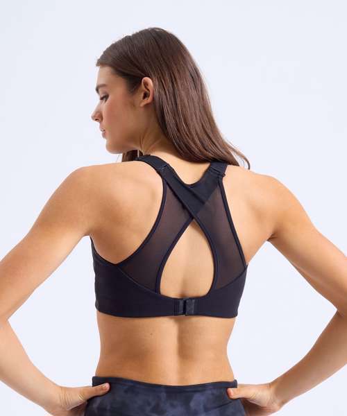 High impact. Certified recycled polyester. Stretch fabric. Mesh crossover back detail. Bust seam shaping. Adjustable straps. Adjustable bra clasp fastening to the back. Double-layer fabric for additional support. Removable bra pads.
