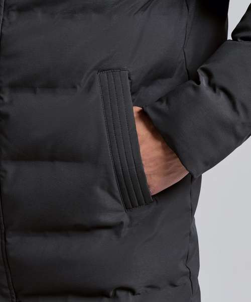 The Recycled bonded longline padded jacket is perfect for outdoor adventurers or hardworking professionals, its extended silhouette providing enhanced coverage to offer versatility across a range of activities. Packed with features designed to retain heat, it includes a detachable hood that easily adjusts to changing weather conditions. With its professional finish and bonded baffle design, this jacket is both stylish and smart.