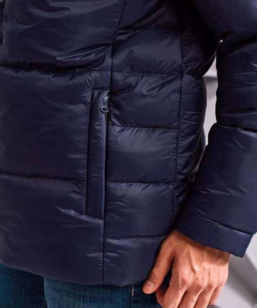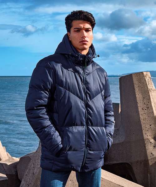 Warm, versatile, multi-baffled jacket. Diagonal ‘v’-stitched sandwiched baffles to chest. Diamond quilting to upper back. Centre front zip with recycled icon zip pull. Three-panelled hood with chin guard, removable via zip. Toggles on hood for a snug fit. Fleece-lined collar. Warm polyfill quilted lining. Two concealed zip front pockets. Inner phone pocket. Embroidery access. Product contains no branded neck label.* Removable Kimble or looped garment tags. Inner seam label holds important product information on one label with a second label containing brand information which can be cut-away.