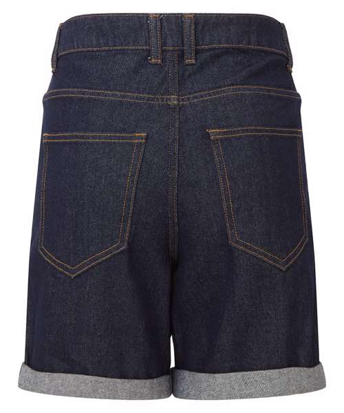 Two front pockets with coin pocket. Brass button and cap detailing. Two back patch pockets. Zip fly and button fastening. Washed denim effect. Contrast stitching. Belt loops. Shorts can be worn rolled up.