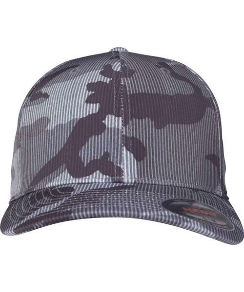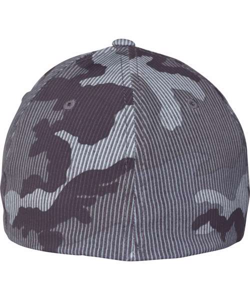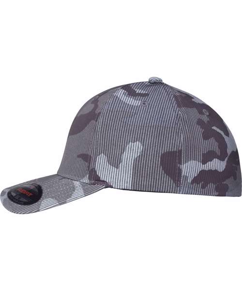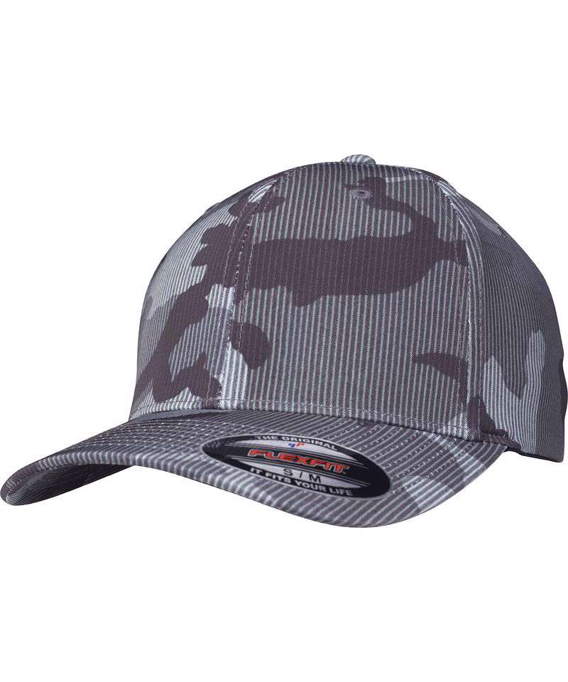 Flexfit camo stripe cap. Trendy camo print and subtle striped design. Slightly curved brim. Patented Flexfit technology.