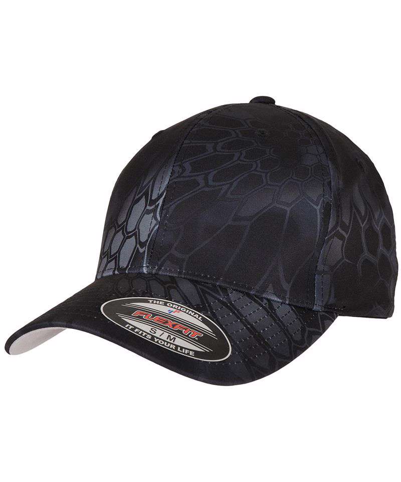 Urban Flexfit cap with a dark themed all-over print, made of polyester, pre-curved visor with decorative stitching, integrated Flexfit band.