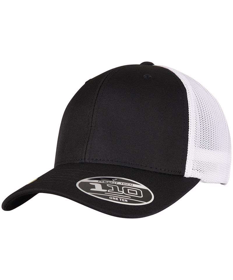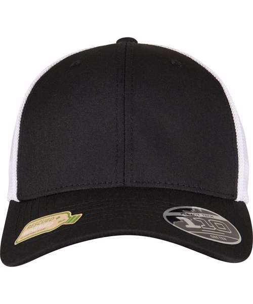 The two-tone trucker cap brings together what belongs together. Both the transparent mesh on the back and the opaque front of the cap are made of recycled polyester, combining a trendy look with a clear conscience. For providing a classy look, the cap comes in black and white. Naturally, it also features a pre-bent, eight-fold stitched visor. Excellent wearing comfort comes through the consistent use of two technologies: integrated Flexfit ribbon and a colour-matched snapback closure for individual size adjustment.